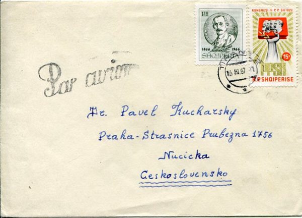 Albania: 1967 (16 March). Cover to Czechoslovakia franked with 15q Albanian Communist Party and 1,10l poet Cajupi commemorative stamps tied by Tirane datestamp. Sc. 921, 978