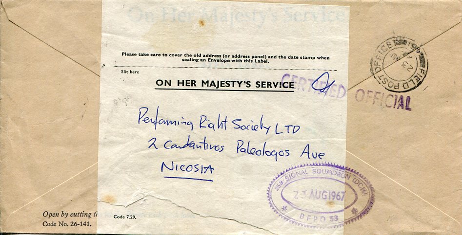 Cyprus: 1967 (23 August). OHMS official cover to Nicosia struck by Field Post Office 461 datestamp and ‘259 Signal Squadron (DCN) * BFPO 53 date cachet. Reverse next day Larnaca cds.