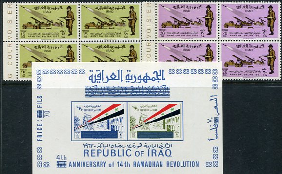Iraq: 1967 (6 January). Army Day unmounted mint block of 4 set and miniature sheet. Mi. 472/473 + Block 10, Sg. 744/745, MS746