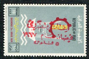 Iraq: ‘Aid for 1967 Flood Victims 5 fils’ officially surcharged in red on 10f Baghdad Fair mint o.g. stamp of 1965. Used between 18 June to 18 December and was compulsory on all mail. Sg. 697