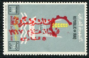Iraq: ‘Aid for 1967 Flood Victims 5 fils’ officially surcharged in red on 10f Baghdad Fair mint o.g. stamp of 1965. Used between 18 June to 18 December and was compulsory on all mail. Sg. 697