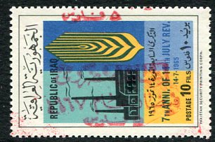 Iraq: ‘Aid for 1967 Flood Victims 5 fils’ officially surcharged in red on 10f Anniversary of 14 July Revolution mint o.g. stamp of 1965. Used between 18 June to 18 December and was compulsory on all mail. Sg. 693