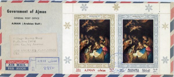 Ajman / Manama: 1968 (25 December). Registered cover with its content to USA franked with Christmas se-tenant perforated set.