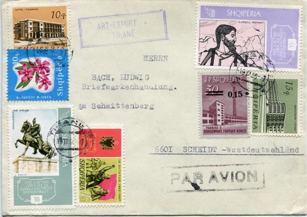 Albania: 1968 (19 March). Commercial cover to Germany franked with 10q, 15q and 15q surcharged on 30q definitive, 10q Flowers, 15q Democratic Front, 30q and 55q Skanderbeg commemorative stamps tied by Tirane datestamps as well as ART-EXPORT / TIRANE cachet. Sc. 841, 856, 869, 870, 1084, 1113/14