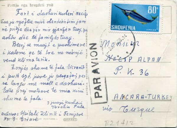 Albania: 1968 (23 July). Postcard to Ankara, Turkey franked with 80q Swordfish and tied by dispatch datestamp. Scarce single franking. Mi. 1136, Sg. 1096