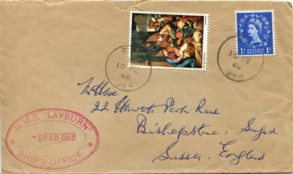 Cyprus: 1968 (10 February). Cover to England franked with 1d and 3d Great Britain stamps tied by FPO 944 field post office datestamp and red H.M.S. LAYBURN * SHIP’S OFFICE handcachet. Reverse 12 February Reigate & Redhill arrival cds.