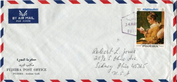 Fujeira: 1968 Post Office cover to United States franked with 50d Painting by Jean Honore Fragonard stamp tied by Fujeira datestamp. Mi. 199