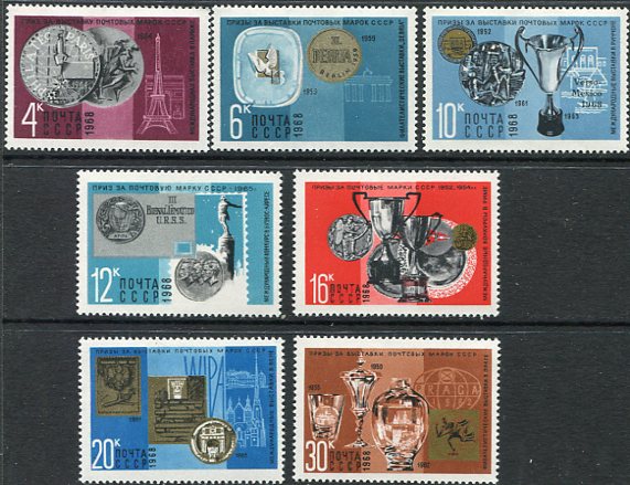 Russia – USSR: 1968 (27 November). Awards to Soviet Post Office at Stamp Exhibitions unmounted mint set. Sg. 3622/3628