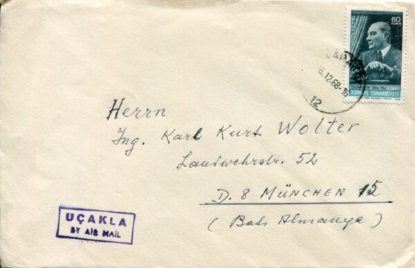 Turkey: 1968 cover from Karaköy, Istanbul to Germany franked with 60k Death Anniversary of Atatürk commemorative stamp sent by famous philatelist Orhan Brandt. Isfila 2502