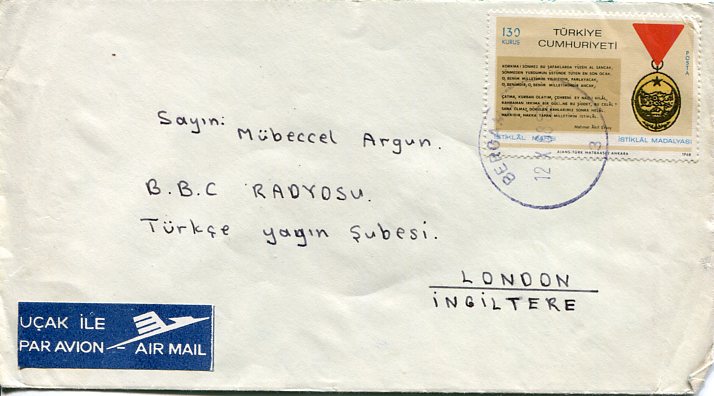 Turkey: 1968 cover to BBC franked with 130k Liberation Medal commemorative stamp tied by Bergama datestamp. Isfila 2495