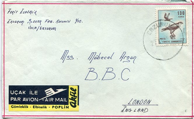 Turkey: 1968 advertised airmail label cover to BBC franked with 130k Harrier Birds airmail stamp tied by Erzurum datestamp. Isfila 2462