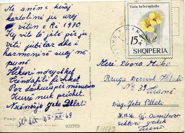 Albania: 1969 (25 December). Postcard of Permet to Tirana franked with 15q flowers stamp and tied by Kamez datestamp. Sg. 1319