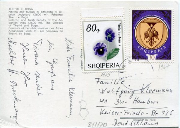 Albania: 1969 postcard of Albanian Alps and villages of Thethi and Boga to Germany franked with 10q Skenderbeg and 80q Flowers tied by Tirane datestamp. Sg. 1185, 1322