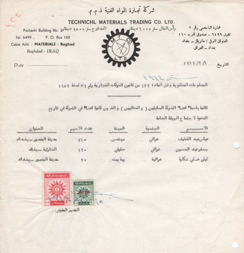 Iraq: 1969 document franked with 50f of 1962-71 Iraqi Republic Emblem and 20f National Defence overprinted revenue stamps. Ross&Powell 305, CD-2