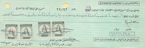 Iraq: circa 1972 document franked with Tower of Samarra 20f, ‘National Defence’ overprinted by Thomas de La Rue 20f and a pair of 20f one without overprint error revenue stamps. Ross & Powell 329, CD-5