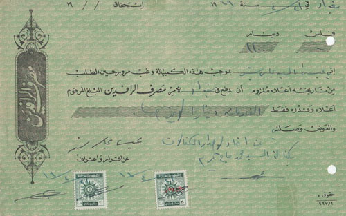 Iraq: 1969 document franked with 20f small Republican Emblem of 1962-71 and 20f National Defence overprinted revenue stamps. Ross&Powell 318, CD-1