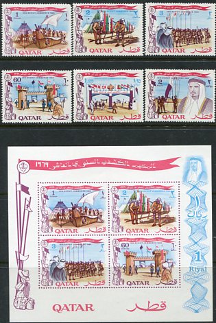 Qatar: 1969 (18 September). Tenth Scout Jamboree unmounted mint set and miniature sheet. Mi. 391/396 – Block 21, Sg. 294/299 – MS300