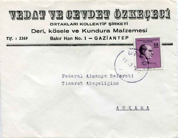 Turkey: 1969 Shoemaker commercial cover to German Embassy at Ankara franked with 50k Ataturk definitive and tied by GAZIANTEP datestamp.