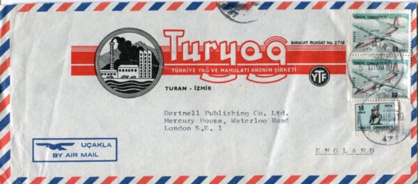 Turkey: 1969 cover from an Oil Merchant in Izmir to England franked with pair of 60k Airmail and 10k definitive stamps. Isfila 2443, 2506