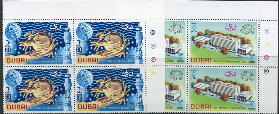 Dubai: 1970 (20 May). New Universal Postal Union UPU Headquarters unmounted mint traffic light block of four. Sg. 353/354, Mi. 369/370. **