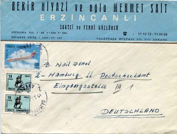 Turkey: 1970 Optician headed airmail cover from Samanpazari, Ankara to Germany. Reverse no postal markings.