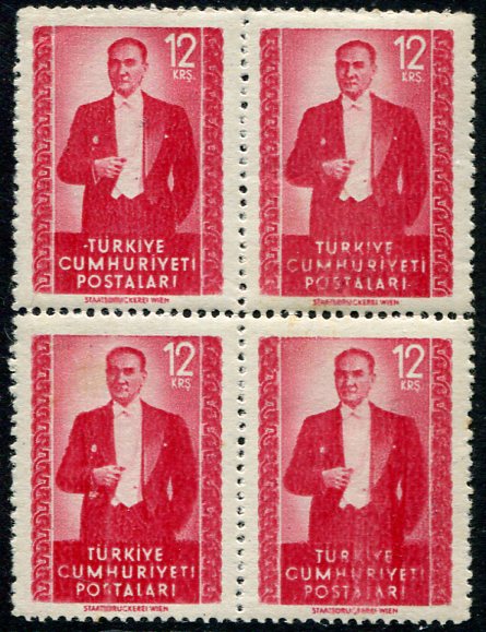Turkey: 1952 (15 March). Ataturk pictorial issue 12k unmounted mint block of four with smudged red on error. Isfila 1684