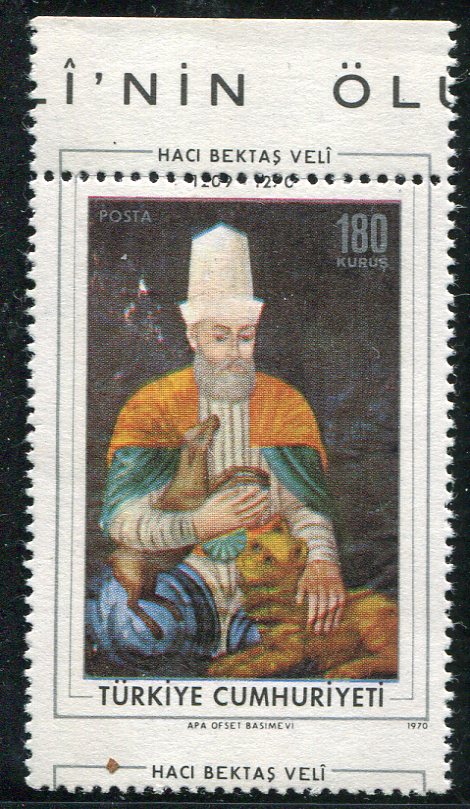 Turkey: 1970 (16 August). 700th Death Anniversary of Haci Bektas Veli 180k top marginal unmounted mint (patchy gum) with frame upwards error. Isfila 2583