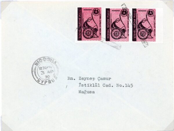 Turkish Cyprus: 1970 (3 April). Cover to Famagusta franked with strip of 5m. Turkish Society Council Social Aid stamps struck by wavy line handstamps and Nicosia datestamp. Reverse no postal markings. This is probably the earliest recorded usage.