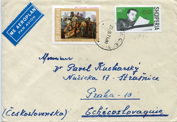 Albania: 1971 (22 September). Cover to Czechoslovakia franked wit 65q Painting and 80q Declaration of Republic Anniversary commemorative stamps tied by Korce datestamps. Reverse same day Tirane transit cds. Sc. 1317, 1336