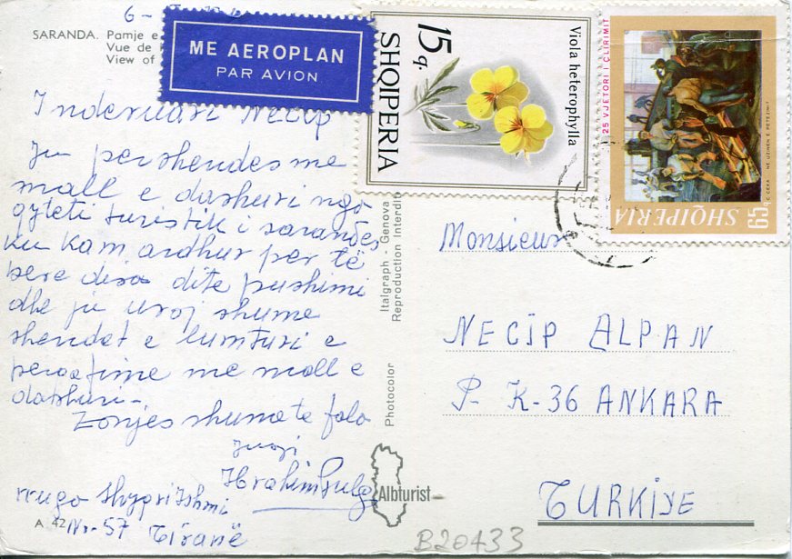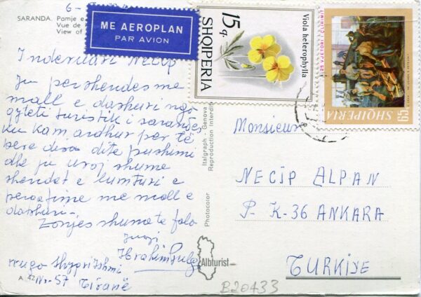 Albania: 1971 postcard of Saranda to Ankara, Turkey franked with 65q Albanian Paintings since 1944 and 15q Flower stamps tied by illegible datestamp. Sg.1303, 1319