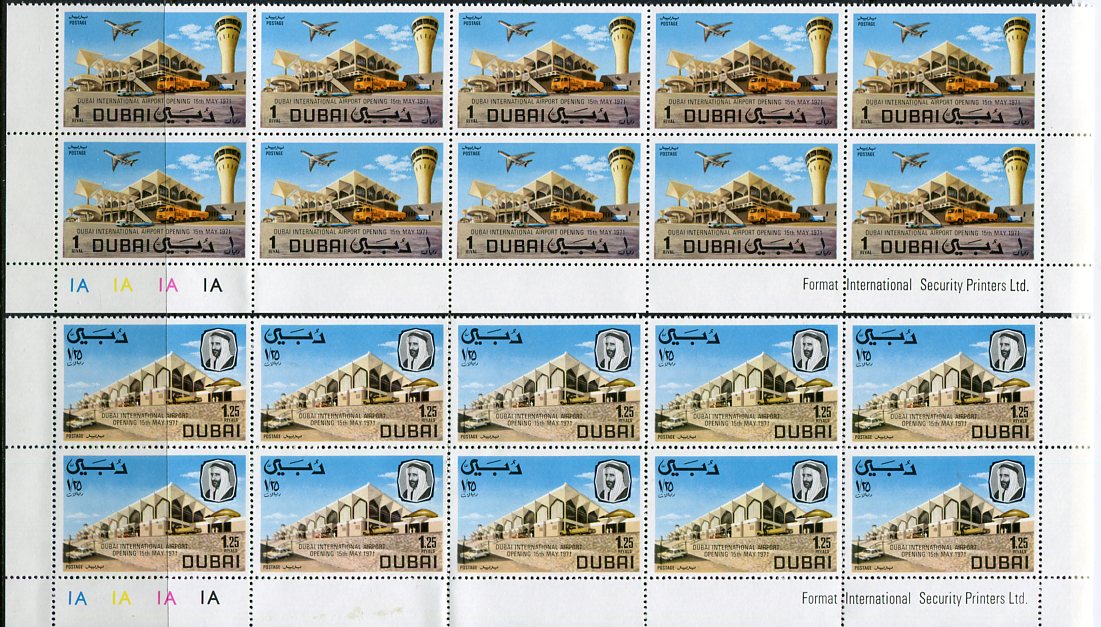 Dubai: 1971 (15 May). Opening of Dubai International Airport unmounted mint plate 1A block of ten set. Sg. 372/373, Mi. 388/389. **