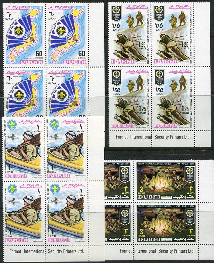 Dubai: 1971 (30 August). 13th World Scout Jamboree, Asagiri, Japan unmounted mint imprint block of four. Sg. 377/380, Mi. 393/396. **