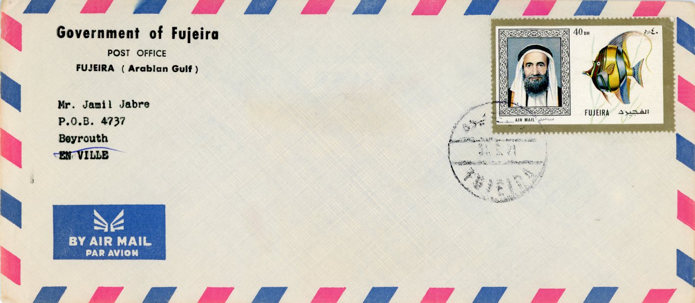 Fujeira: 1971 cover to Beirut franked with 40Dh.fish airmail stamp tied by 31 May datestamp. reverse blank. Mi. 657