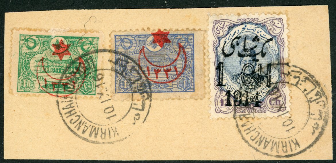 Iran – Ottoman Invasion: 1916 (10 September). Piece franked with 1ch. surcharged 13ch. revalued Ahmed Mirza portrait and 10pa. and 1pi. wartime overprinted Ottoman stamps tied by KIRMANCHAH (DEPART) datestamps.