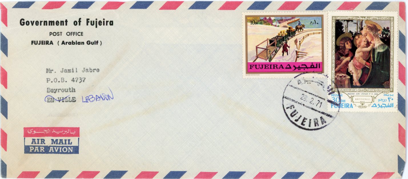 Fujeira: 1971 cover to Beirut franked with 10Dh. Railroad and 30Dh. Botticelli stamps tied by 28 February datestamp. reverse blank. Mi. 594, 635