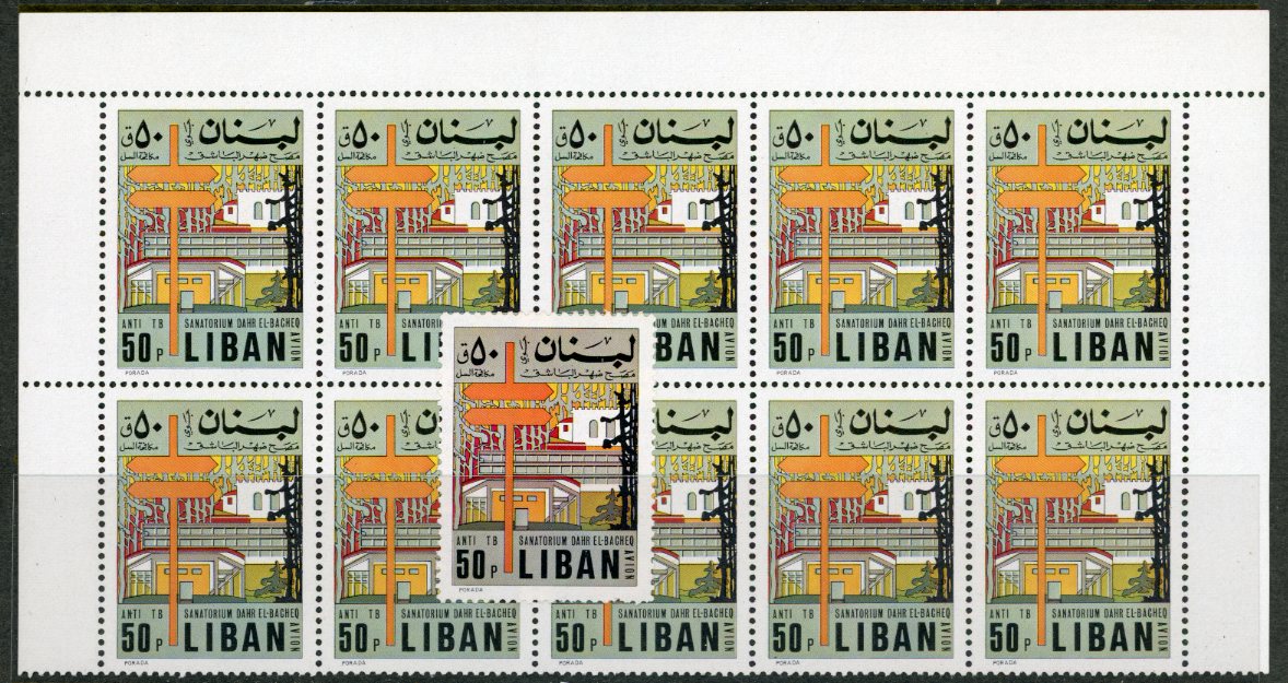 Lebanon: 1971 Tuberculosis Relief Campaign 50p. unmounted mint top marginal block of ten with colour variation. Single stamp is for comparison only and not included in the lot. Sg. 1101 **