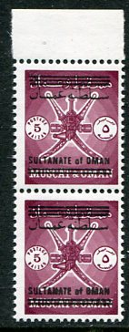 Oman: 1971 (16 January). Bilingual SULTANETE of OMAN overprinted by National Press, Dubai on 1970 Muscat & Oman New Currency 5b reddish purple unmounted mint marginal vertical pair. Sg. 122