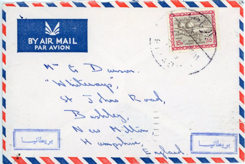 Saudi Arabia: 1971 cover from Riyadh to Bordon, England franked with 15p Gas Oil Plant.