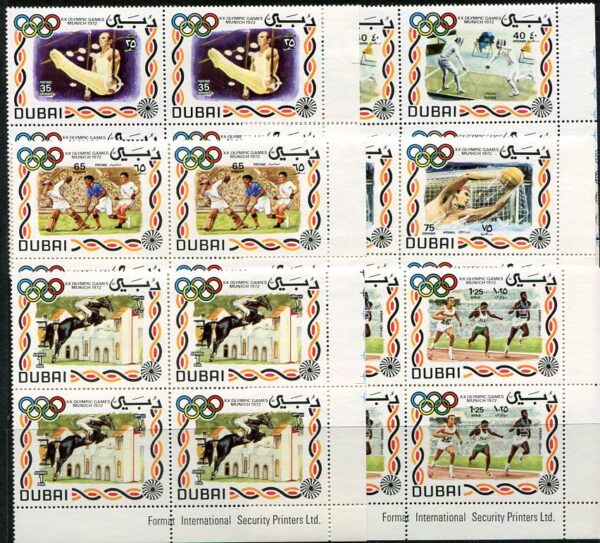 Dubai: 1972 (31 July). Olympic Games, Munich unmounted mint imprint block of four set. Gymnastics, Fencing, Athletics, Hockey, Water Polo, Horse Jumping. Sg. 399/404, Mi. 410/415. **