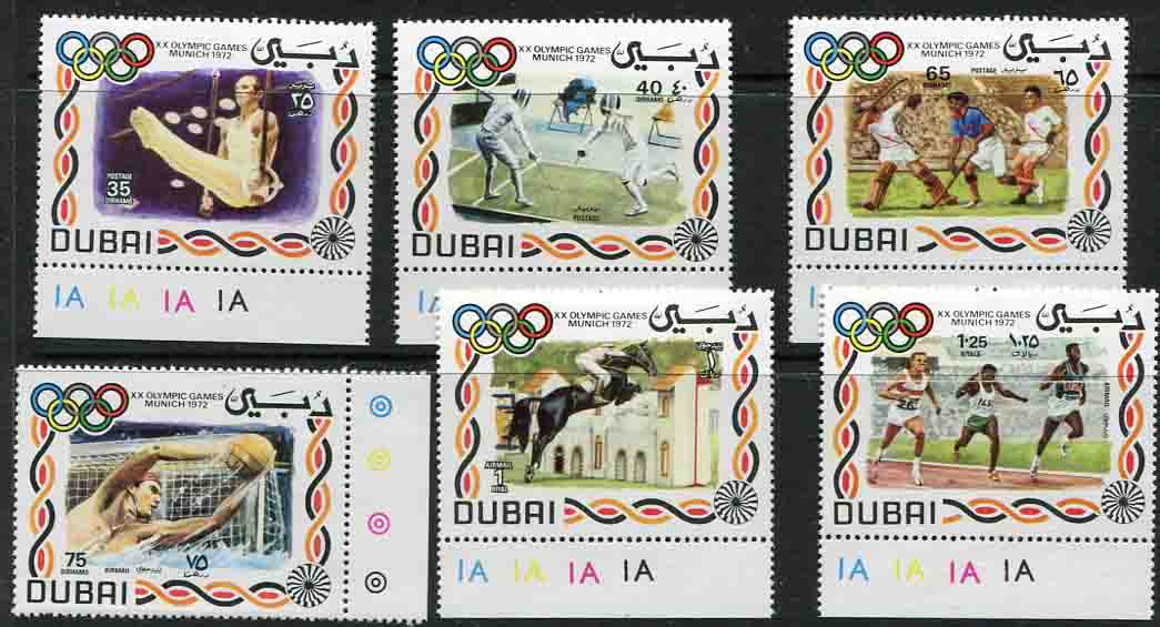 Dubai: 1972 Olympic Games, Munich unmounted mint plate number marginal set of 6. Gymnastics, Fencing, Athletics, Hockey, Water Polo, Horse Jumping. Sg. 399/404