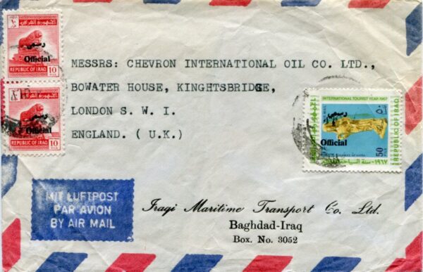 Iraq: 1972 (July). ‘Iraqi Maritime Transport’ imprinted cover to England franked with “official” overprinted pair of 10f Lion of Babylon and 50f Statue Tourism issue stamps tied by Baghdad datestamp. Reverse firm handcachet. Rare usage of official stamp to abroad. Seldom seen. Sg. O972, O1042