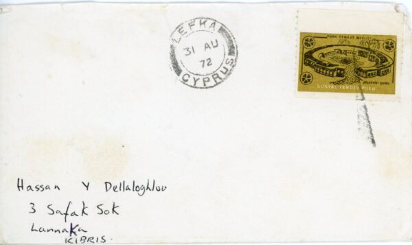 Turkish Cyprus: 1972 (31 August). Cover to Larnaca franked with marginal 15m. Turkish Society Council Social Aid stamp struck by wavy line handstamp and Lefka datestamp. Reverse 1 September Nicosia transit cds.