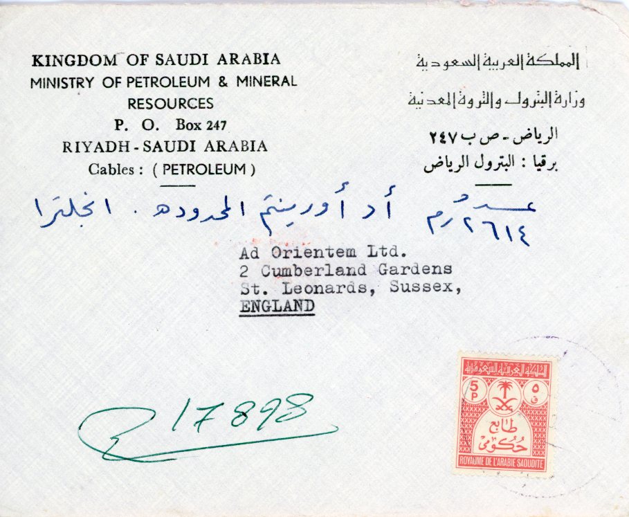 Saudi Arabia: 1972s Ministry of Petroleum & Mineral official cover to England franked with 5p. official stamp.