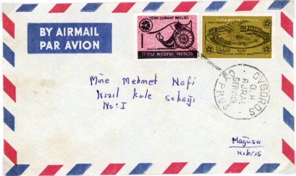 Turkish Cyprus: circa 1972/1973 cover used in Famagusta district franked with 5m. and 15m. Turkish Society Council Social Aid stamp struck by wavy line handstamp and Ovgoros (today Ergazi) G.R. Rural Service cancellation. Reverse no postla markings.