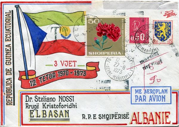 Albania: 1973 (27 August). Cover with hand drawn flag of Equatorial Guinea franked with 15c and 50c French stamps tied by Le Havre – Seine – Maritime datestamps to Albania taxed on arrival with 50q flower commemorative stamp and tied by 4 September arrival cds as well as circular “T” postage due and “taxe percue” cachets. Reverse 3 September Tirane Etranger and next day Elbasan cds’s.