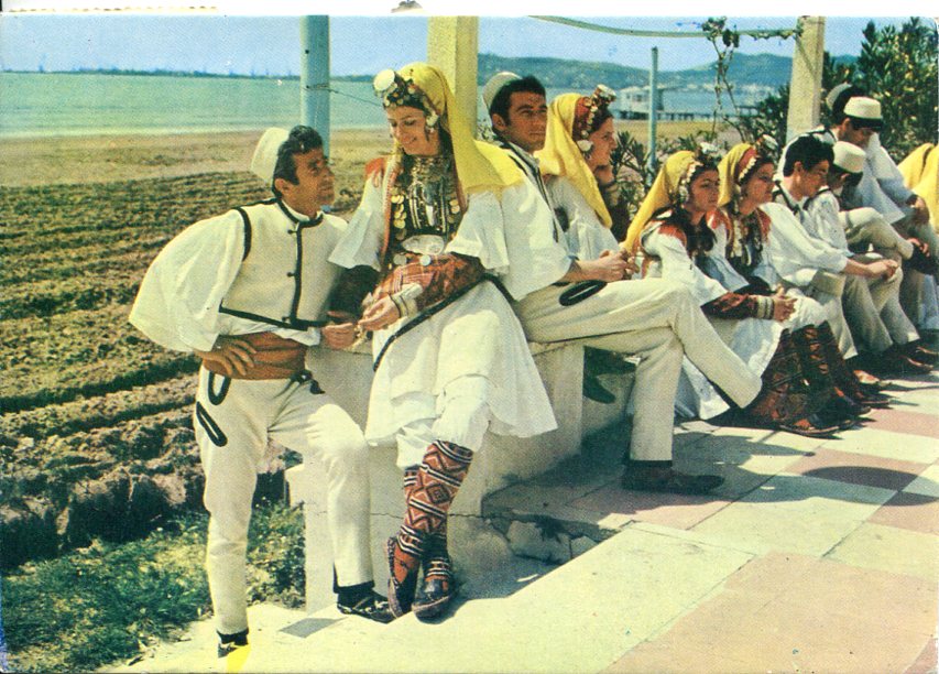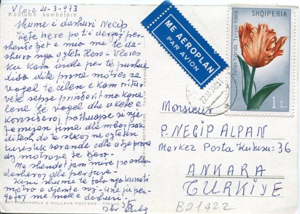 Albania: 1973 (22 March). Traditional Albanian costumes postcard to Ankara, Turkey franked with 1l Tulip flower tied by Vlore datestamp.