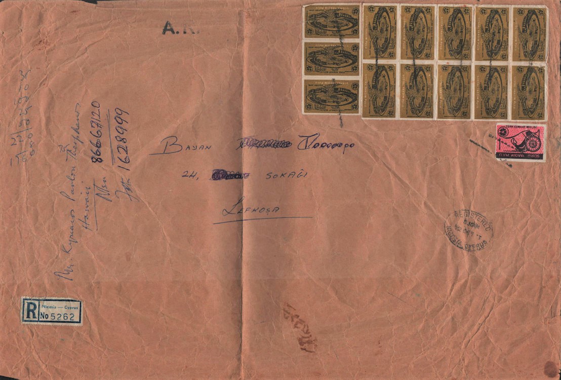 Turkish Cyprus: 1973 (12 October). Large registered A.R. cover used in Nicosia franked with 5m, strip of three and block of ten 15m Social Aid stamps handstamped by black wavy lines also struck by oval Registered . Nicosia Cyprus datestamp and top A.R. handstamp. It is one of the largest 15m multiples on cover recorded. Folded on middle, reverse no postal markings.