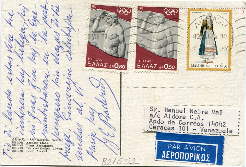 1973 postcard from Athens to Venezuela written in Esperanto.