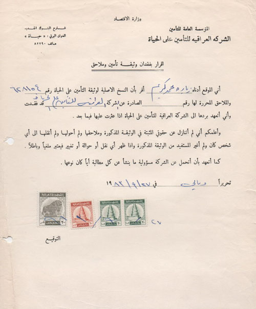 Iraq: 1973 document franked with 200f Lion of Babylon, 10f and two 20f Tower of Samarra of 1969 revenue stamps. Ross&Powell 319, 320, 324