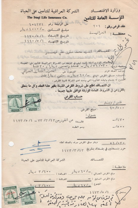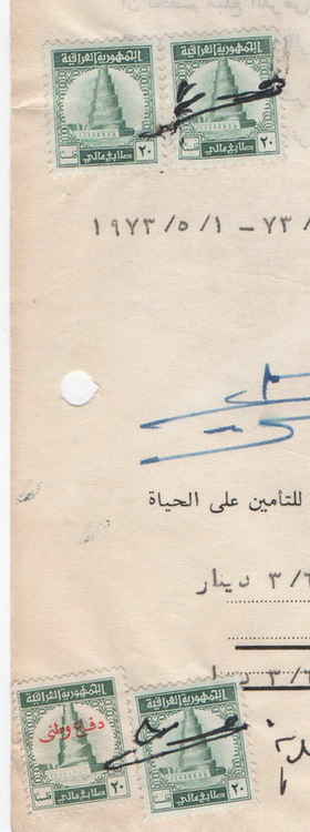 Iraq: 1973 Life Insurance document franked with three 20f Tower of Samarra 1969 and 20f overprinted National Defence revenue stamps. Ross&Powell 320, CD-3
